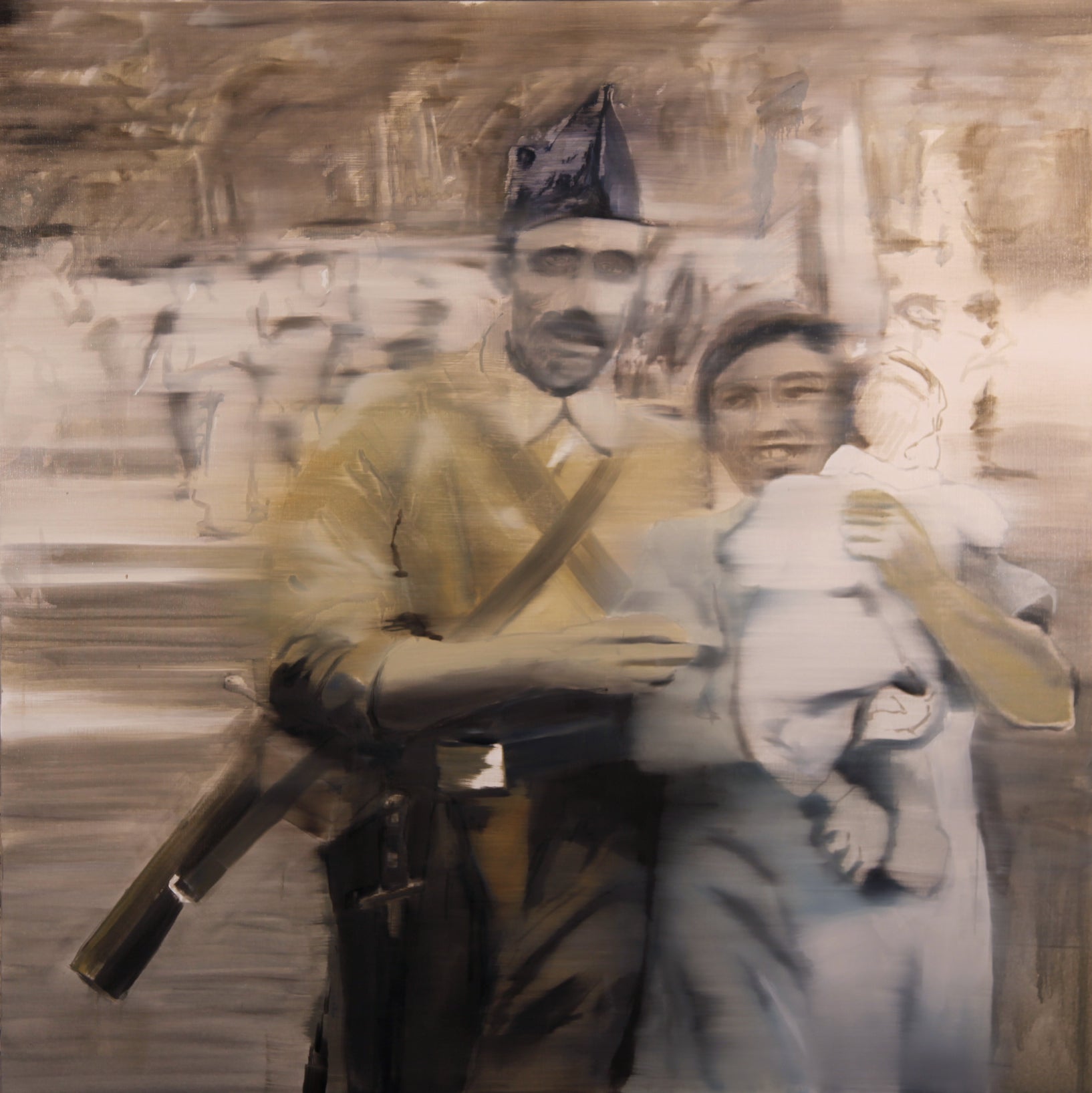 Solo un instante robado a la guerra, donde el tiempo parece suspenderse. Este retrato no busca la gloria de los héroes, sino la presencia silenciosa del amor en medio del caos. lo que la cámara captó fue un instante, lo que la pintura revela es una vida entera atravesada por la guerra.
