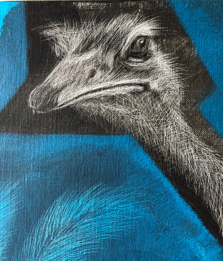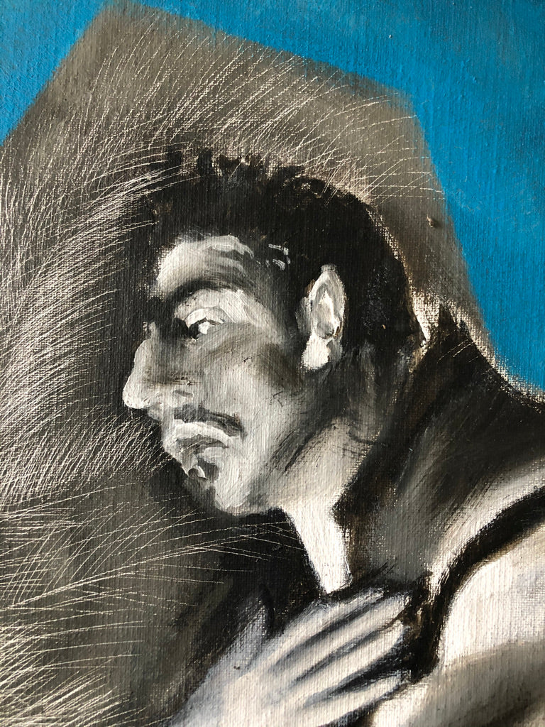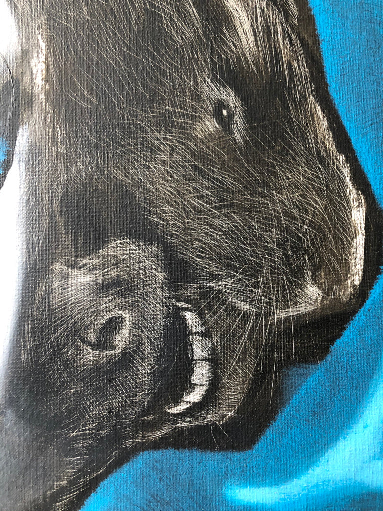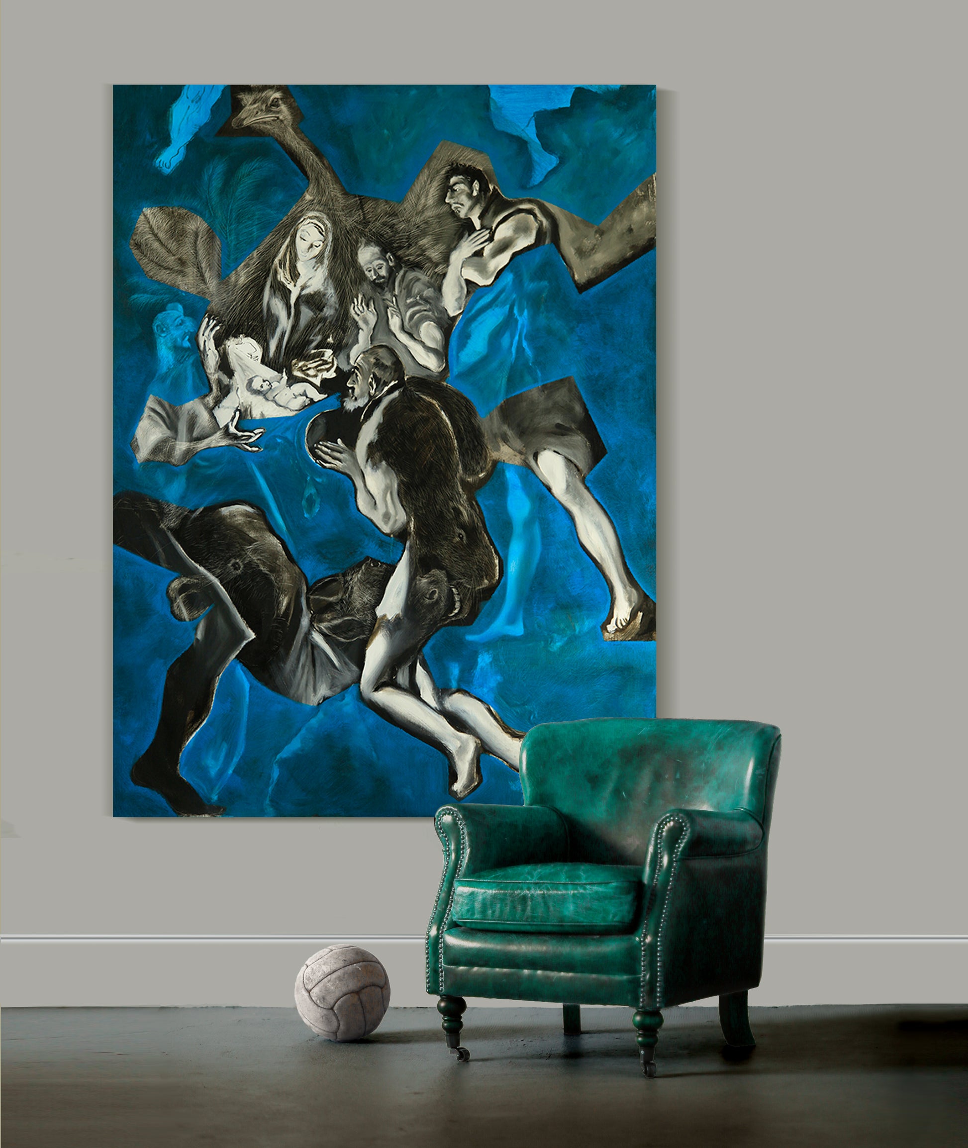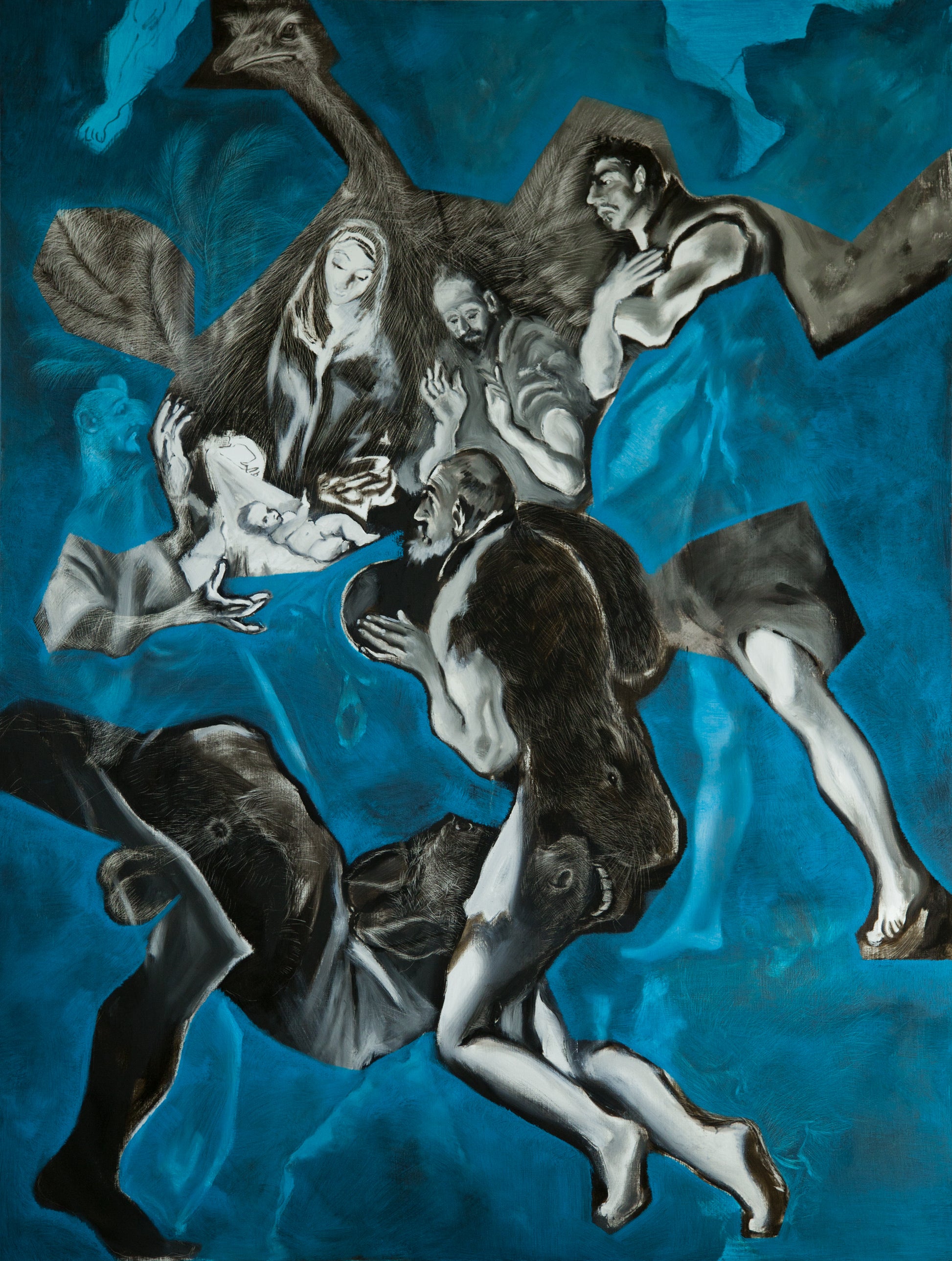 No es un momento sagrado detenido en el tiempo, sino una explosión contenida de cuerpos, gestos y presencias. La escena se ha rasgado: figuras flotan en un azul profundo, como si la pintura se debatiera entre la fe y la fractura.