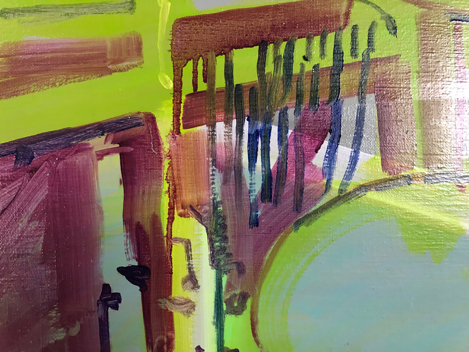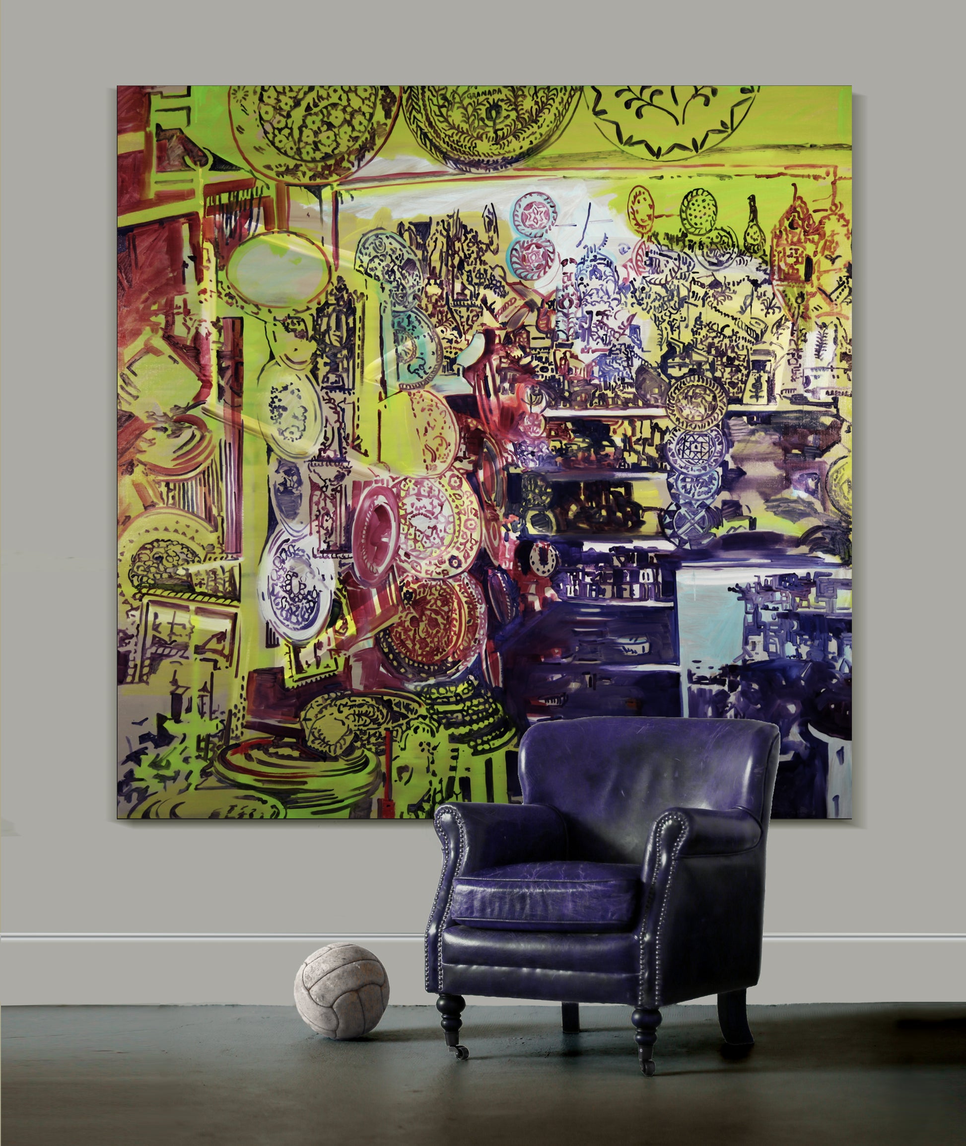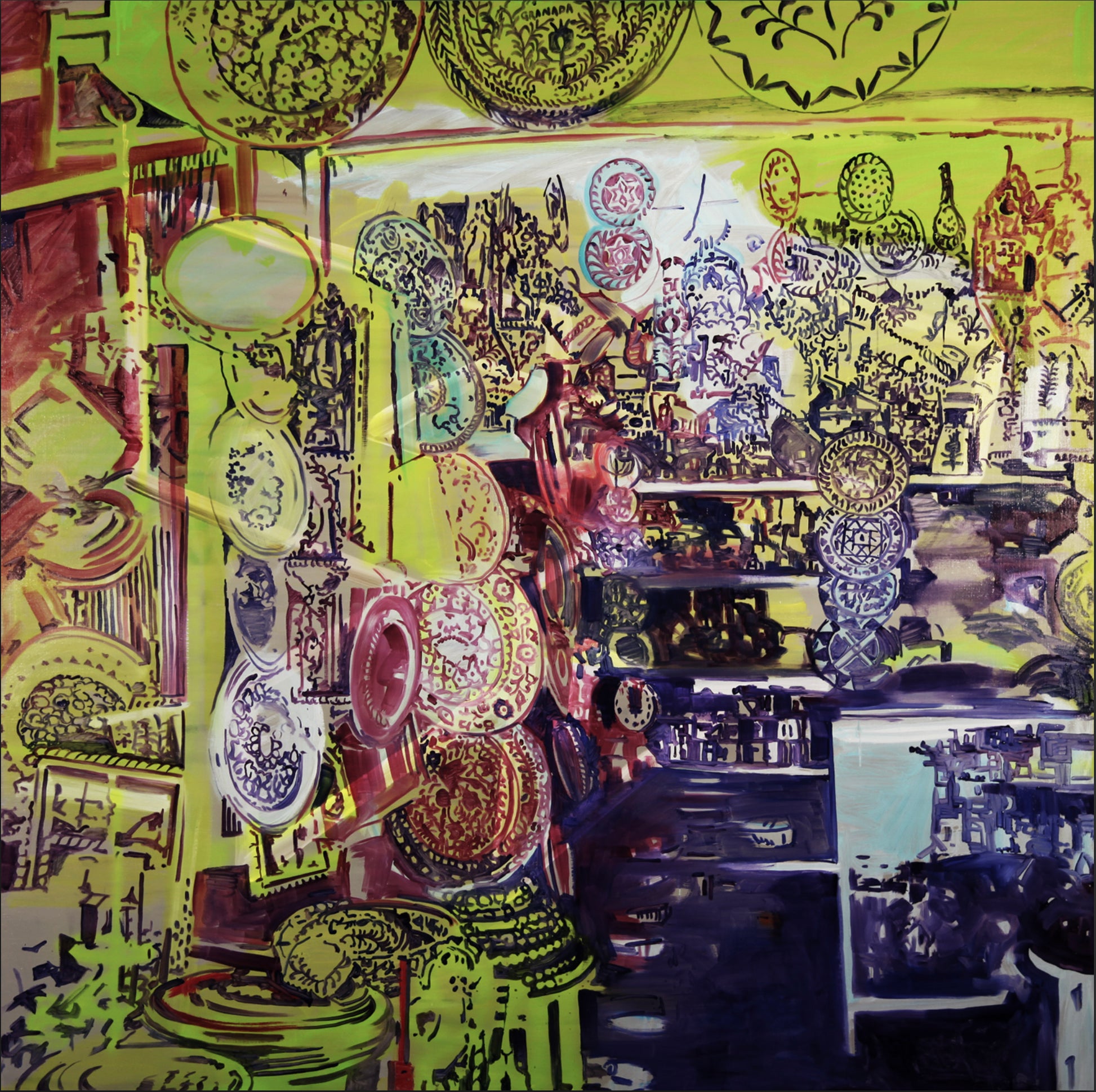 Aquí todo brilla, pero nada descansa. Los objetos se amontonan como recuerdos sin jerarquía: platos, vasos, adornos, patrones... un inventario decorativo que se multiplica hasta el vértigo. La pintura no los ordena, los celebra y los desborda.